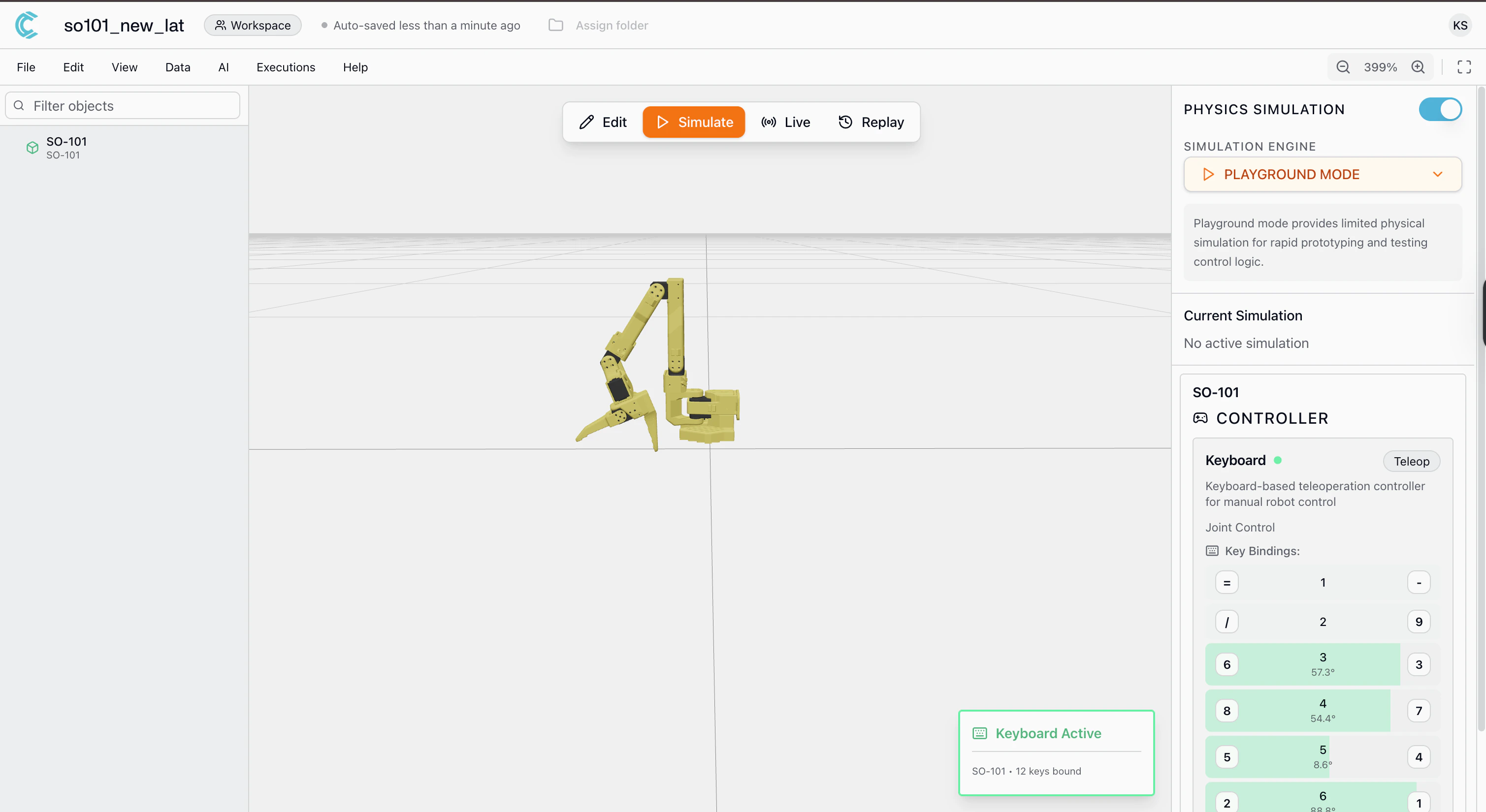 You’re controlling a physical robot from your browser. Everything you see here, joint control, camera streaming, dataset recording is the same experience you get with your own hardware.