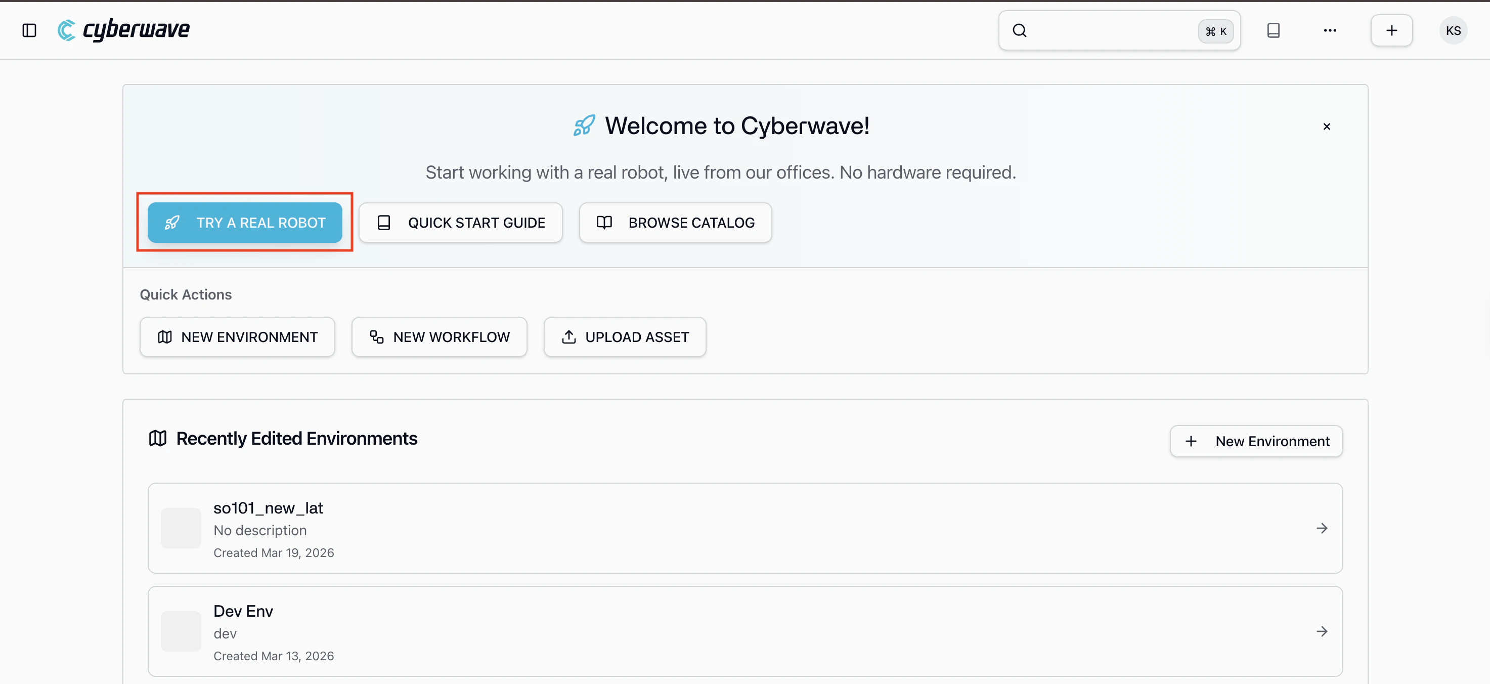 From the dashboard, click Try a Real Robot. You’ll be connected to a live SO101 robot arm with a camera in the Cyberwave robotics lab.