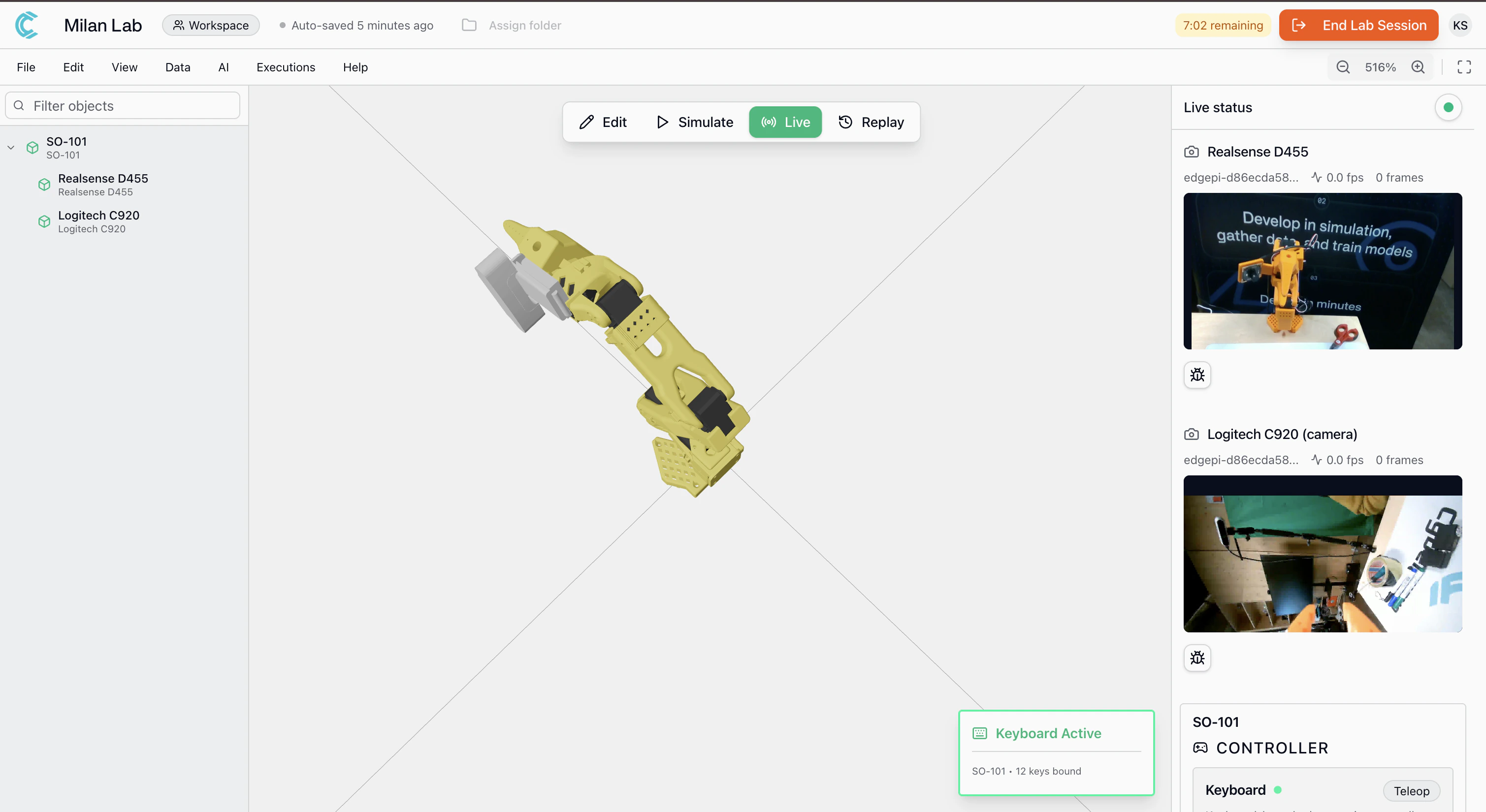 Get hands-on with Cyberwave in under 2 minutes; no setup, no hardware, no code. Control a real SO101 robot arm live in our robotics lab from your browser.Sign up for Cyberwave